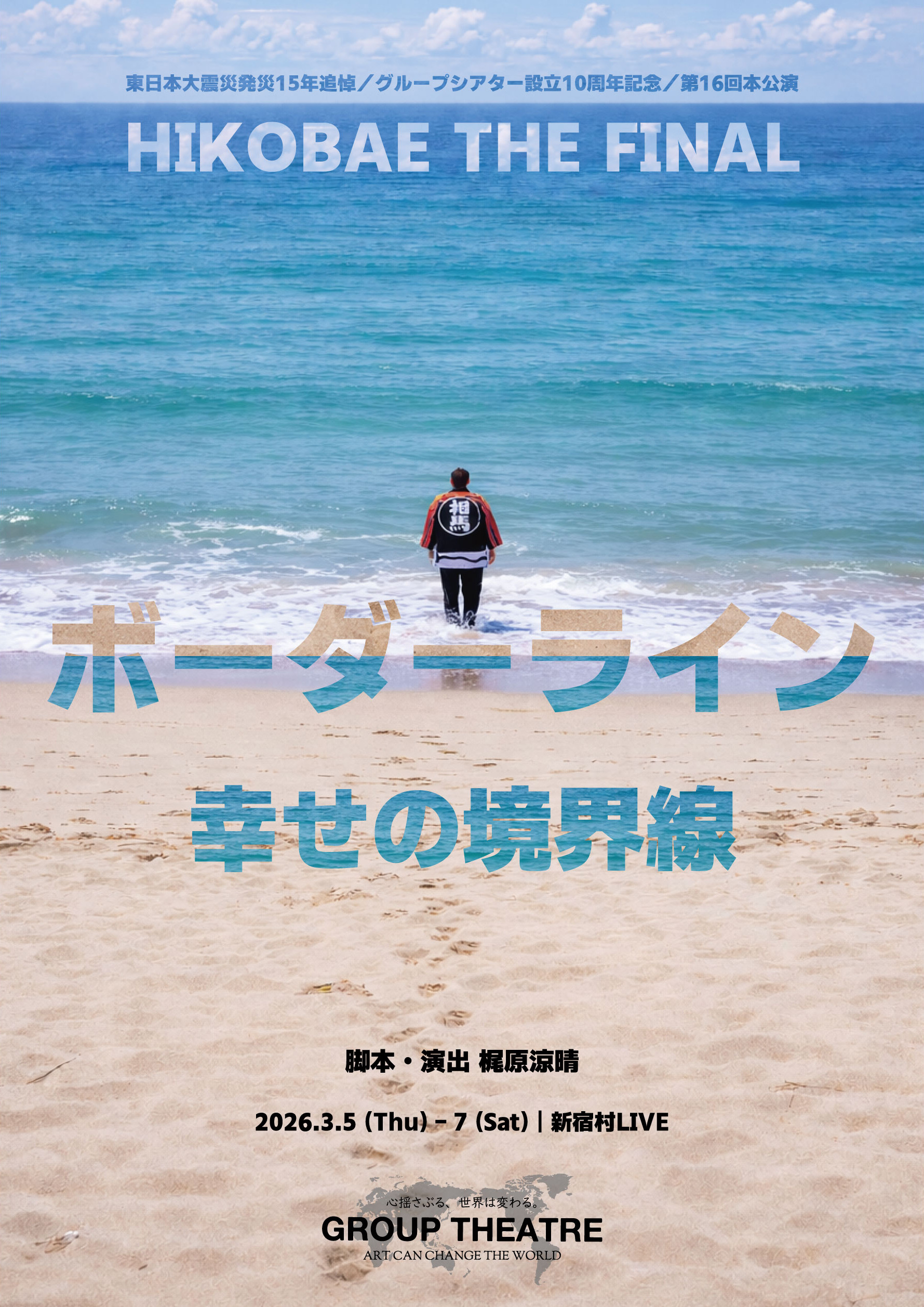 公演期間 2026/03/05(木) - 03/07(土)東日本大震災発災15年追悼/グループシアター設立10周年記念/第16回本公演ボーダーライン - 幸せの境界線あの日、無数の尊い命が真っ黒な分厚い壁に飲み込まれた。 今、無数の境界線が私たちの精神を包囲し孤独へと追い詰める。 東日本大震災発災15年、記録は情報に埋もれ、記憶は時間とともに薄れゆく。 生かされたすべての命が未来へ繋ぐべきものとは──。